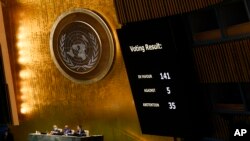Բանաձևին ձեռնպահ են քվեարկել 35 անդամներ, այդ թվում՝ Չինաստանը, Հայաստանը, Հնդկաստանը, Իրանը, Իրաքը, Կուբան, Ղազախստանը, Ղրղզստանը, Տաջիկստանը և այլ երկրներ: Հինգ երկրներ՝ Ռուսաստանը, Սիրիան, Բելառուսը, Հյուսիսային Կորեան և Էրետրիան դեմ են քվեարկել բանաձևին։ Ադրբեջանը, Վենեսուելան, Ուզբեկստանն ու ևս ինն այլ երկրներ չեն մասնակցել բանաձևի քվեարկությանը: